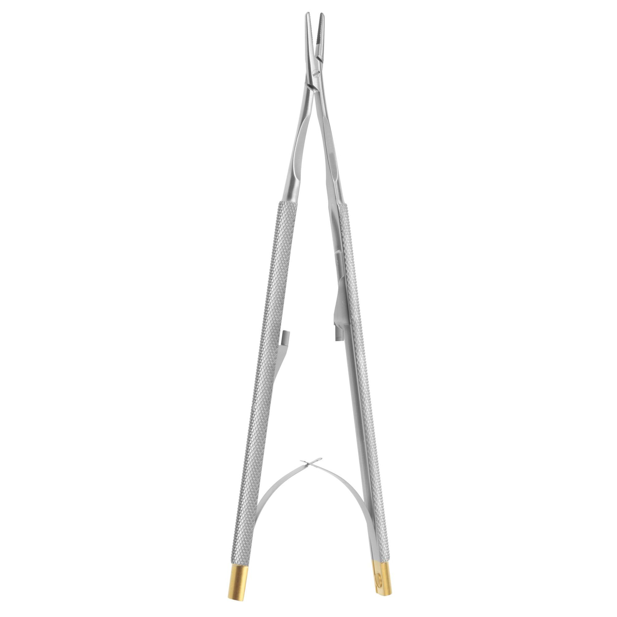 For needles: 4-0, 5-0, 6-0 Used to grasp suture needles during suturing when pushing/pulling the needle and suture through tissue. It has short serrated jaws at the distal end to provide better grip of the needle and it is available in a wide variety of sizes and designs, such as: 1) a self-retaining, scissors-like design with ring handles at the proximal end; 2) a tweezer-like design with bowed, hinged handles that are operated by squeezing them together; and 3) a heavy-duty pincer-like design. some types may utilize inserts made of hard materials (e.g., tungsten carbide) and include scissor blades.