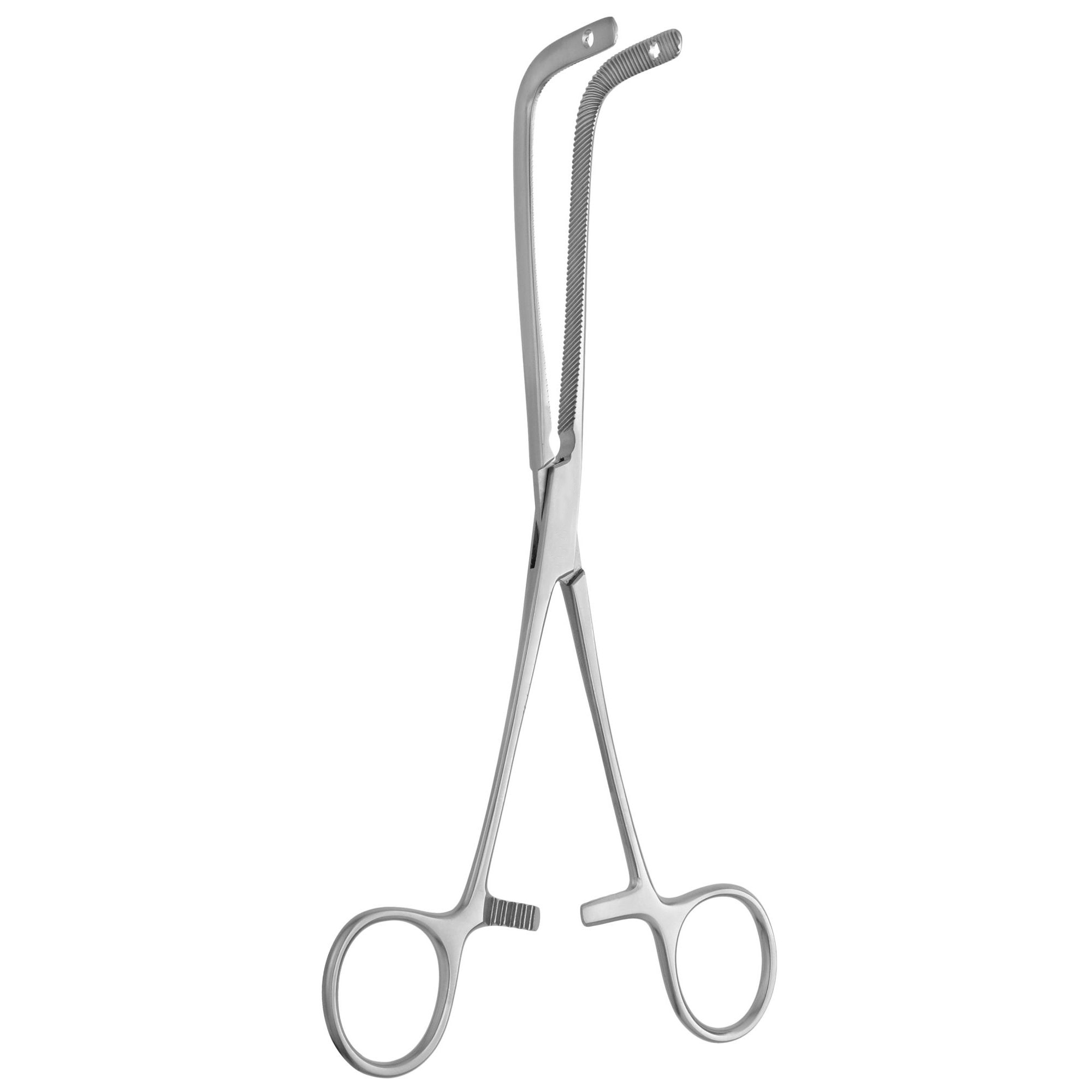 Used for grasping and holding a bone during a surgical procedure. It is typically strongly constructed and has a scissors-like design that may or may not be self-retaining with ring handles or curved shank handles. It is available in various sizes and the working end can have a wide variety of jaws designs, e.g., curved serrated jaws, straight toothed jaws, or profiled wrench-like jaws with grooves to provide extra grip of the bone.
